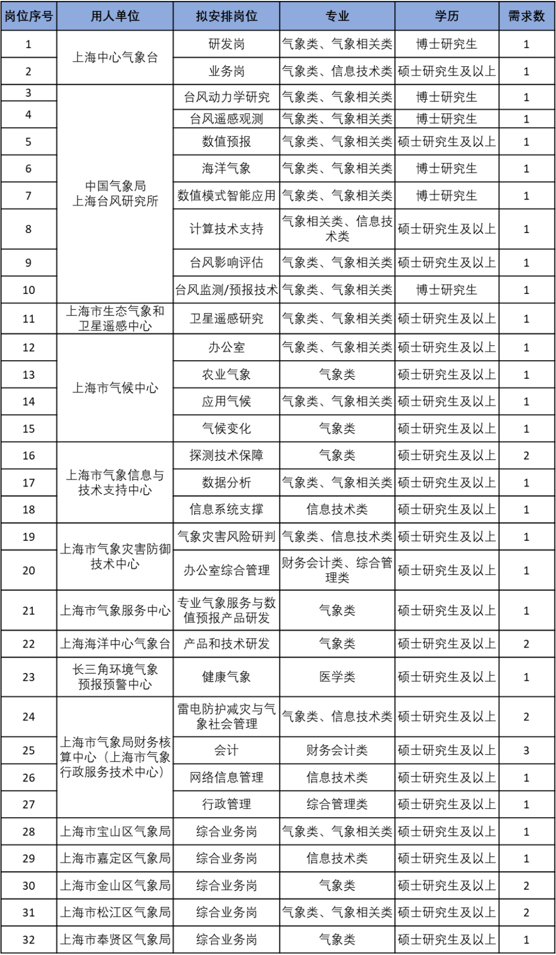上海市气象局所属事业单位2023年度高校毕业生招聘计划表