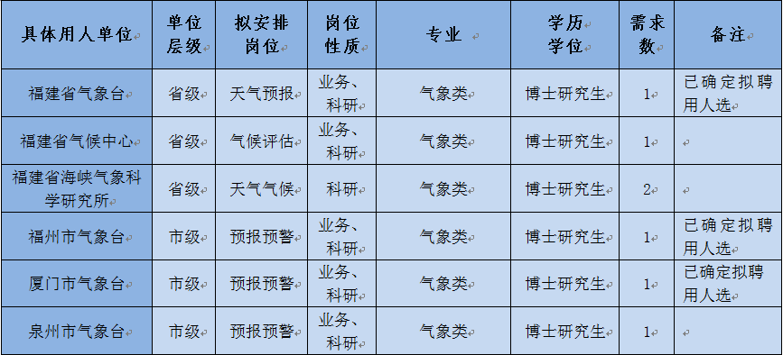 招聘信息在中国气象局网站、福建省气象局网站(网址:http://fj.cma.gov.cn/)公开发布。
