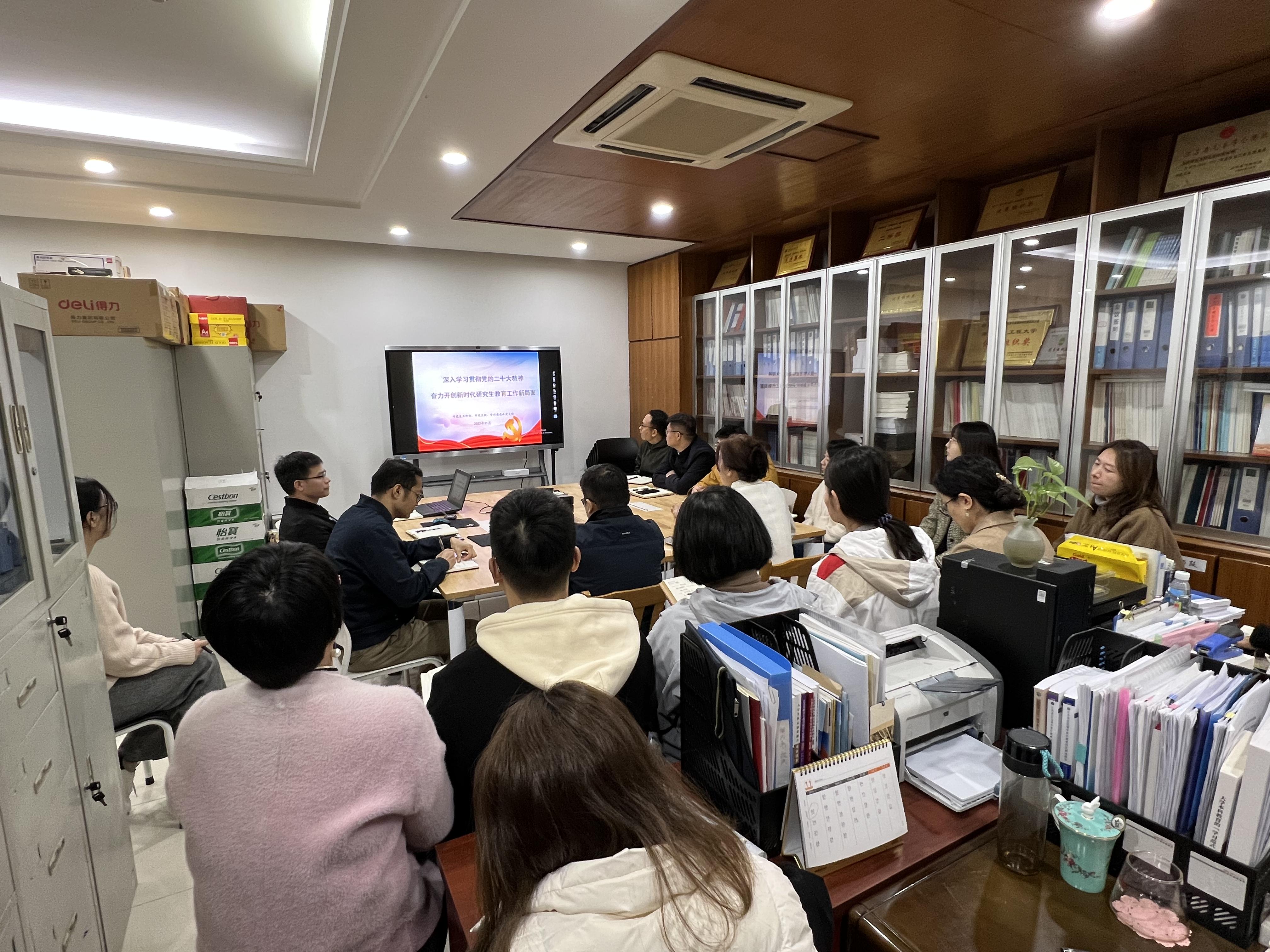 为深入学习贯彻党的二十大精神,11月4日上午,研究生工作部、研究生院、学科建设处党支部在行政楼311会议室召开“深入学习贯彻党的二十大精神,奋力开创新时代研究生教育工作新局面”专题学习会,支部全体党员参加学习,会议由支部书记袁敏主持。